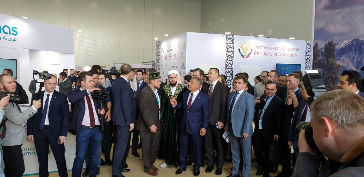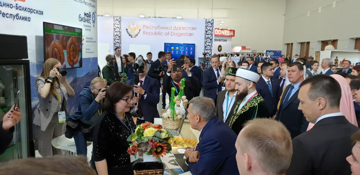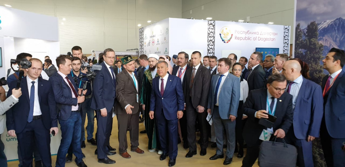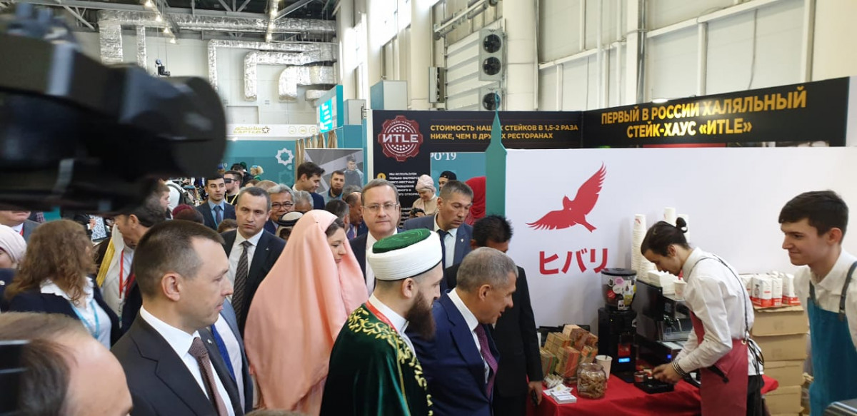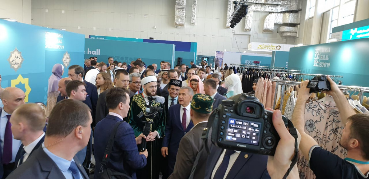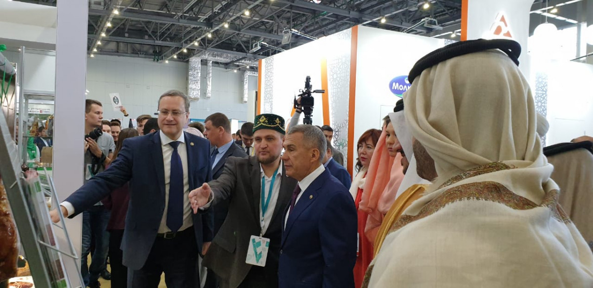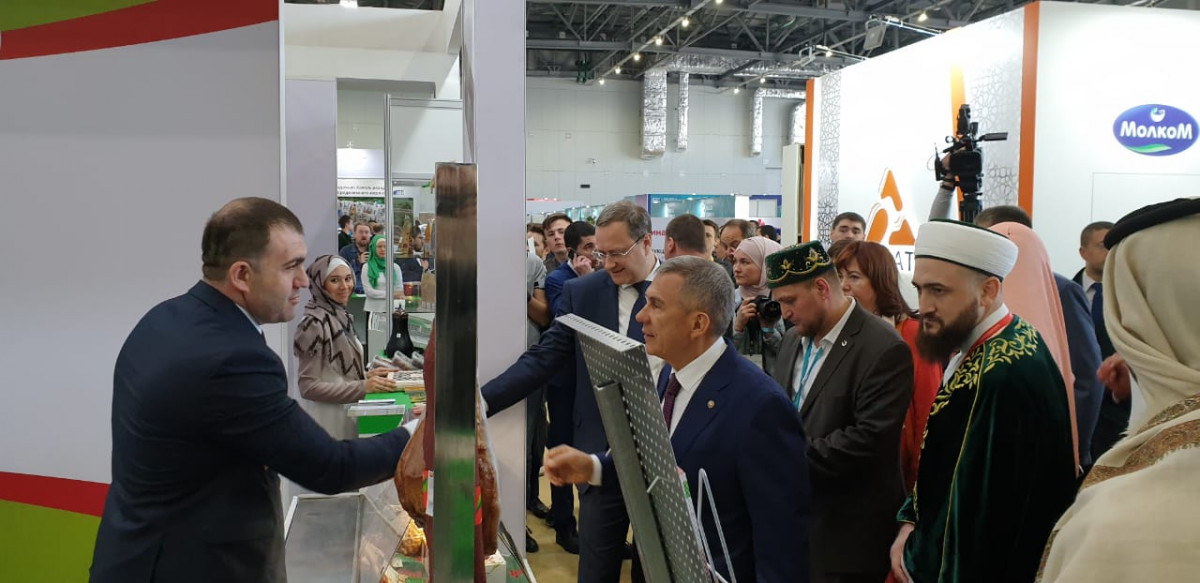 Күргәзмәгә керешкә Рөстәм Нургалиевичны саммитның күпләгән кунаклары һәм катнашучылары белән бергә Татарстан мөселманнары башлыгы Камил хәзрәт Сәмигуллин һәм ТР инвестицион үсеш агентлыгы җитәкчесе Талия Миңнуллина каршылады. Мөфти хәзрәтләре республика Президентын сәламләп аңа кыскача күргәзмә, аның экспонентлары һәм күрсәтелгән хәләл сәнәгате өлкәләләре турында сөйләде. Елдан-ел күбрәк танылып барган RUSSIA HALAL EXPO Халыкара күргәзмәсе быел Россиядә һәм аның хәләл үсеше тарихында иң зурлардан санала. 2018 елда күргәзмәнең экспозициясе 1,4 мең кв. м. мәйданны биләгән булса, быел ул 3,5 мәртәбәгә киңәеп, 5 мең кв.м. тәшкил итә. Күргәзмә азык-төлек һәм туклану, косметика һәм химик сәнәгать, мода һәм матурлык индустриясе, туризм һәм кунакчыллык, күпләп һәм ваклап сату, финанслар һәм инвестицияләр, киң кулланыштагы товарлар секторлары компанияләрен үз эченә берләштереп, икътисадның барлык өлкәләрен диярлек колачлый. Барлыгы 84 экспонент. Күргәзмәне оештыручылар - ТР Инвестицион үсеш агентлыгы, "Хәләл" стандартлары Комитеты, ТР Мөселманнарының Диния нәзарәте.