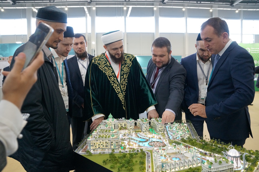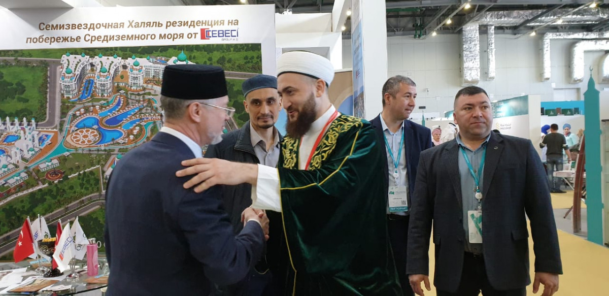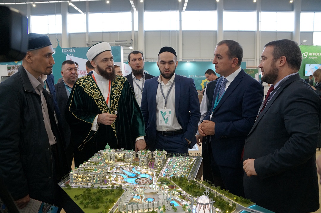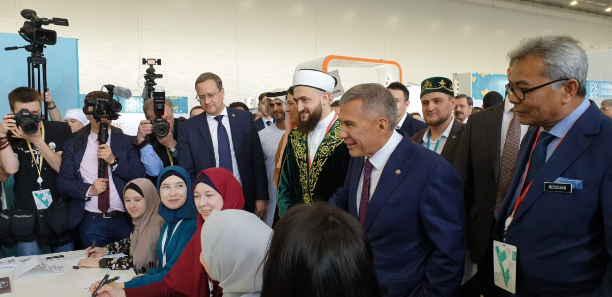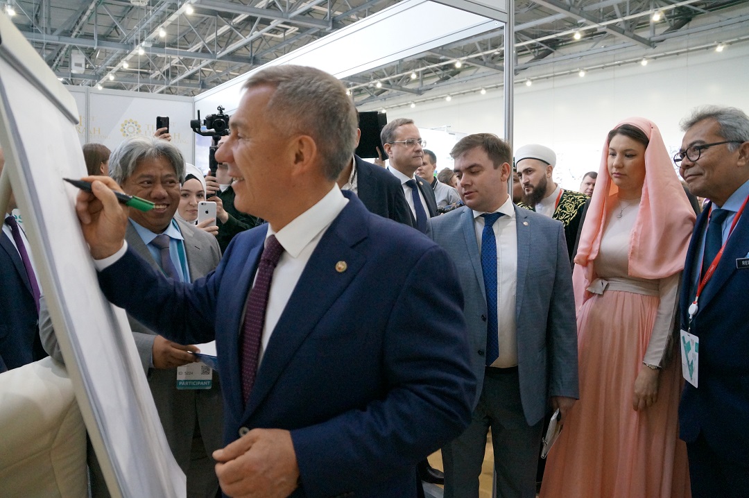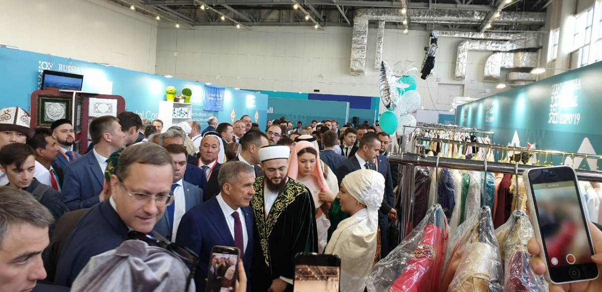Күргәзмәгә керешкә Рөстәм Нургалиевичны саммитның күпләгән кунаклары һәм катнашучылары белән бергә Татарстан мөселманнары башлыгы Камил хәзрәт Сәмигуллин һәм ТР инвестицион үсеш агентлыгы җитәкчесе Талия Миңнуллина каршылады. Мөфти хәзрәтләре республика Президентын сәламләп аңа кыскача күргәзмә, аның экспонентлары һәм күрсәтелгән хәләл сәнәгате өлкәләләре турында сөйләде. Елдан-ел күбрәк танылып барган RUSSIA HALAL EXPO Халыкара күргәзмәсе быел Россиядә һәм аның хәләл үсеше тарихында иң зурлардан санала. 2018 елда күргәзмәнең экспозициясе 1,4 мең кв. м. мәйданны биләгән булса, быел ул 3,5 мәртәбәгә киңәеп, 5 мең кв.м. тәшкил итә. Күргәзмә азык-төлек һәм туклану, косметика һәм химик сәнәгать, мода һәм матурлык индустриясе, туризм һәм кунакчыллык, күпләп һәм ваклап сату, финанслар һәм инвестицияләр, киң кулланыштагы товарлар секторлары компанияләрен үз эченә берләштереп, икътисадның барлык өлкәләрен диярлек колачлый. Барлыгы 84 экспонент. Күргәзмәне оештыручылар - ТР Инвестицион үсеш агентлыгы, "Хәләл" стандартлары Комитеты, ТР Мөселманнарының Диния нәзарәте.