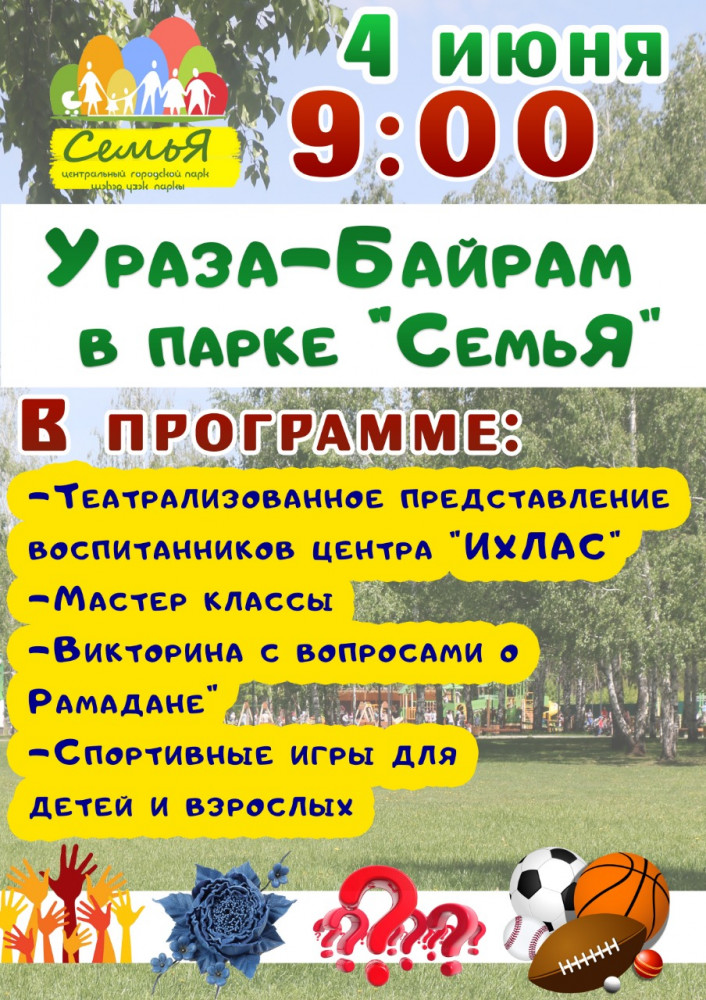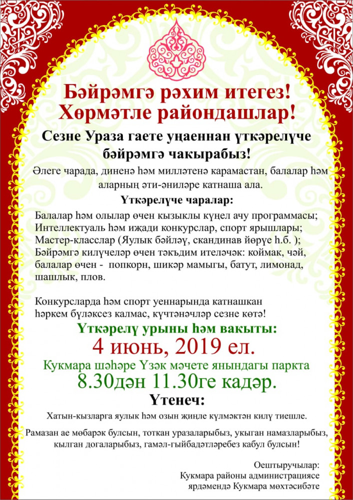 4 июньдә 15.00дә Бөгелмәнең балалар паркында Рамазан ае тәмамлану уңаеннан “Ураза-бәйрәм-2019” дип исемләнгән гаилә бәйрәме була. Программада нәшидләр, мөнәҗәтләр, мәртәбәле кунакларның чыгышлары каралган. Моннан тыш, төрле мастер-класслар, интеллектуаль викторина, балалар арасында асфальтта рәсем ясау буенча бәйге, шулай ук милли көрәш, армрестлинг, армлифтинг һәм башка ярышлар узачак, “Рамазан базар” хәләл-милли ярминкәсе эшлиячәк. Сабыйларны аквагрим, сабын куыгы очыру, кәгазь тамашалары белән сөендерәчәкләр. Паркка килүчеләрне кайнар пылау белән сыйлау да күздә тотыла. Программа бәйрәм фейерверкы белән төгәлләнәчәк.