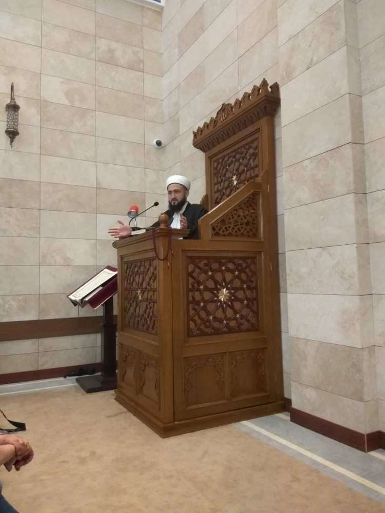 Үзенең вәгазен мөфти хәзрәт Мөхәммәд Пәйгамбәр ﷺ хәдисе белән башлады: “Иң яхшы сүз – Аллаһының Сүзе”. Аннары ул Коръәннең “Мәгүн” сүрәсенә тәфсир (аңлатма) бирүгә тукталды. Әлеге сүрәдә монафикъларның намазга зур әһәмият бирмәүләре ассызыклана: “Алар намаз вакытына, рәкәгатьләр санына, аның рөкеннәренә игътибарсыз, әлеге гыйбадәтне тавык бөртек чукыган кебек башкаралар. Монафикълар – кешеләрнең үзләрен яратуларын һәм мактаганнарын гел көтеп торганга күрә һәрвакыт икейөзлеләнәләр һәм изгелек кылуны тыялар”.
