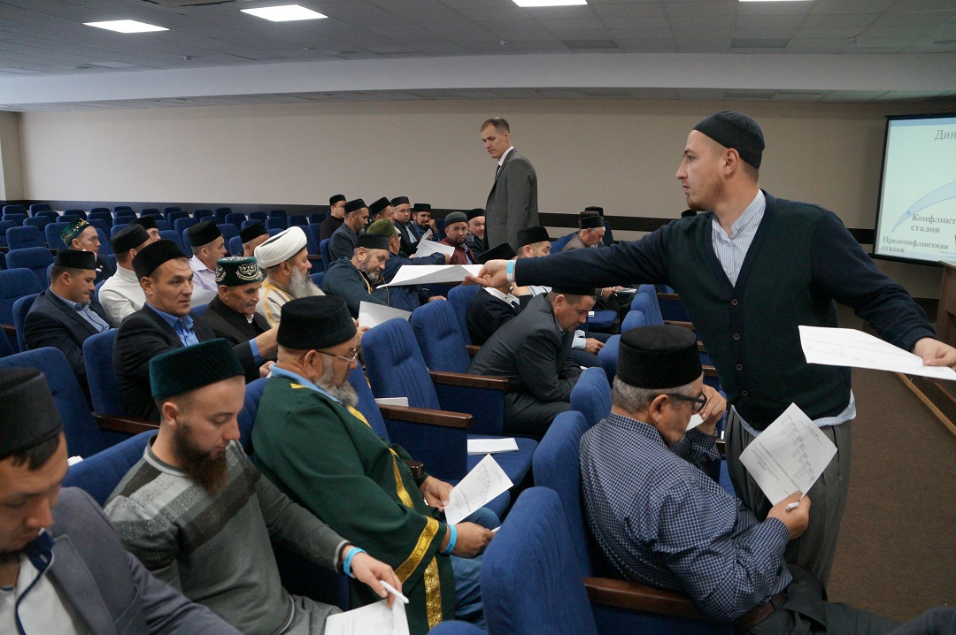 Белем күтәрү курсларының беренче ике көнендә мөхтәсибләргә һәм казыйларга белем бирүче остазлар арасында - Диния нәзарәтенең Голәмалар шурасы җаваплы сәркатибе, ислам фәннәре докторы Рөстәм хәзрәт Нургалиев, КФУның Медиация, конфликтларны җайга салу һәм экстремизмны профилактикалау үзәге мөдире Олег Маврин һәм конфликтолог Резеда Галихуҗина. Дәресләрдә шәригатьтә мирас һәм гаилә хокукы, шулай ук этноконфессиональ конфликтлар белән идарә итү, милли куркынычсызлык системасында экстремизмны һәм террорчылыкны профилактикалау, дингә кагылышлы Россия Федерациясе законнарының үтәлеше турында сөйләнә, иң зур һәм актив мәхәллә һәм мөхтәсибәтләрнең эшчәнлек тәҗрибәләре өйрәнелә һ.б.