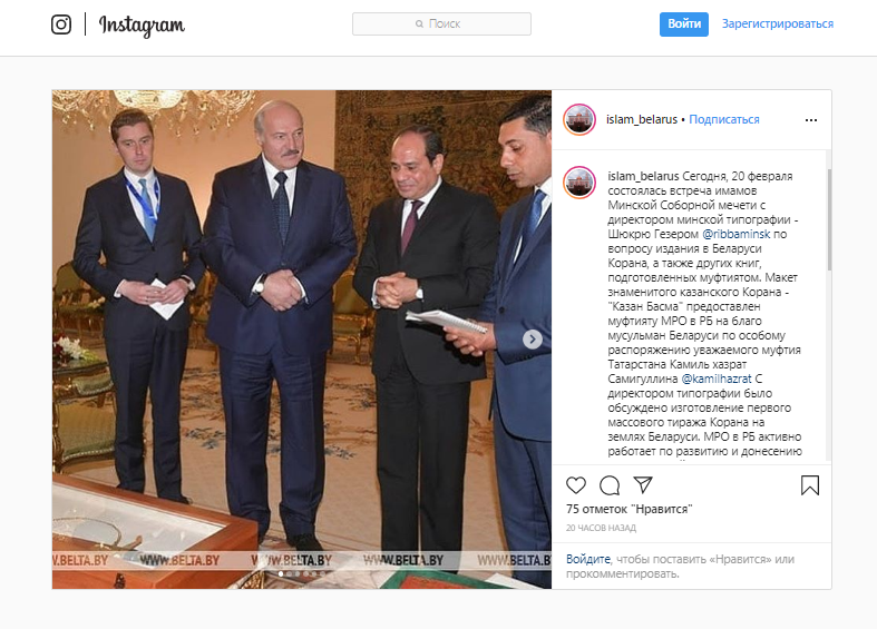 Беларусь Республикасы Президенты Александр Лукашенко Мисыр башлыгы Абдель Фәттах әс-Сисига Казанда Татарстан мөселманнары Диния нәзарәте белгечләре тарафыннан әзерләнгән һәм махсус әлеге дәүләт сәфәре өчен Минскта бастырылган Коръән басмасын бүләк иткән. Китап 19 февральдә Каһирәдә ике дәүләт башлыгының очрашу барышында тапшырылган. Басманың эчтәлеге электрон файллар рәвешендә Татарстан мөфтие Камил хәзрәт Сәмигуллин тарафыннан Беларусь мөфтиятенә – “Беларусь Республикасында мөселман дини берләшмәсенә” Татарстан Республикасы Президенты Р.Н.Миңнеханов җитәкчелегендәге Татарстан рәсми делегациясенең Минскка рәсми сәфәре вакытында тапшырылган иде. Шул чакта, Казан басмасының электрон нөсхәләреннән тыш, Беларусь мөфтие Әбу-Бәкер хәзрәт Шабанович Камил хәзрәт кулыннан белорус теленә тәрҗемә итү өчен “Калям Шариф. Перевод смыслов” китабының да электрон файлларын да кабул итеп алган иде. Бүгенге көндә хезмәт өстендә “Беларусь Республикасында мөселман дини берләшмәсе"ндә махсус төзелгән комиссия эшли.