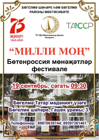 “Милли моң” мөнәҗәтләр фестивале 19-нчы сентябрьдә сәг.09.30-да Татар мәдәнияте үзәгендә узачак. Адресы: Бөгелмә шәһәре, Гашек урамы, 3 нче йорт. Фестивальнең нигезләмәсе белән түбәндә танышырга мөмкин.
