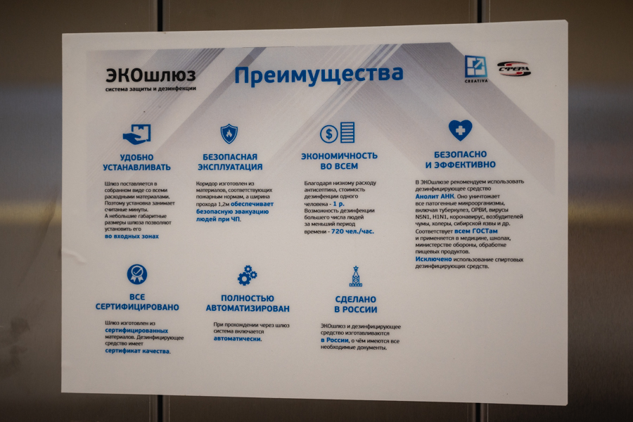 Әлеге җайланма Казан шәһәрендә эшләнә һәм ул бик күп өстенлекләргә ия. Вирус һәм бактерияләр кешенең киемендә, тәнендә һәм чәчендә сакланырга мөмкин. “ЭКОшлюз” җайланмасы ярдәмендә кеше 3-5 секунд эчендә дезинфекция үтә. Ул барлык патогенлы микроорганизмнарны, шул исәптән туберкулез, ОРВИ, N5N1, H1N1 вирусларын, коронавирусны, чума, холера, себер язвасы китереп чыгаручы бактерияләрне һәм башкаларны юк итә. Җайланма барлык ГОСТ таләпләренә җавап бирә. Бүген әлеге җайланманы җитештерүчеләр аның белән файдалану тәртипләре белән таныштырдылар, инструктаж үткәрделәр.