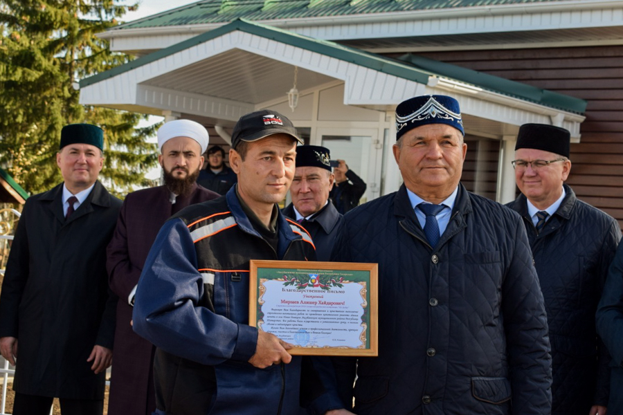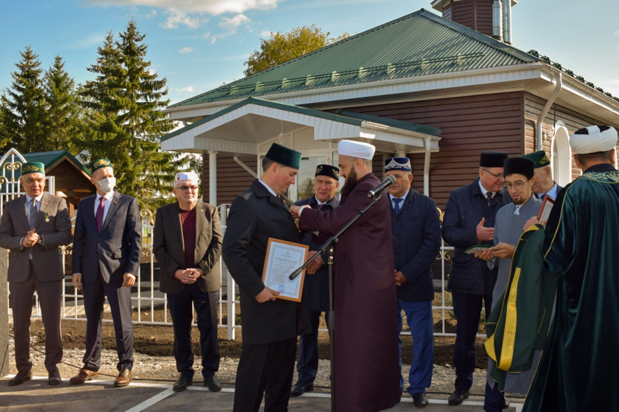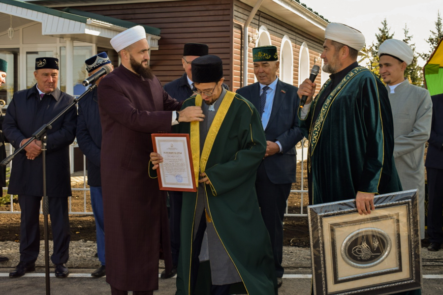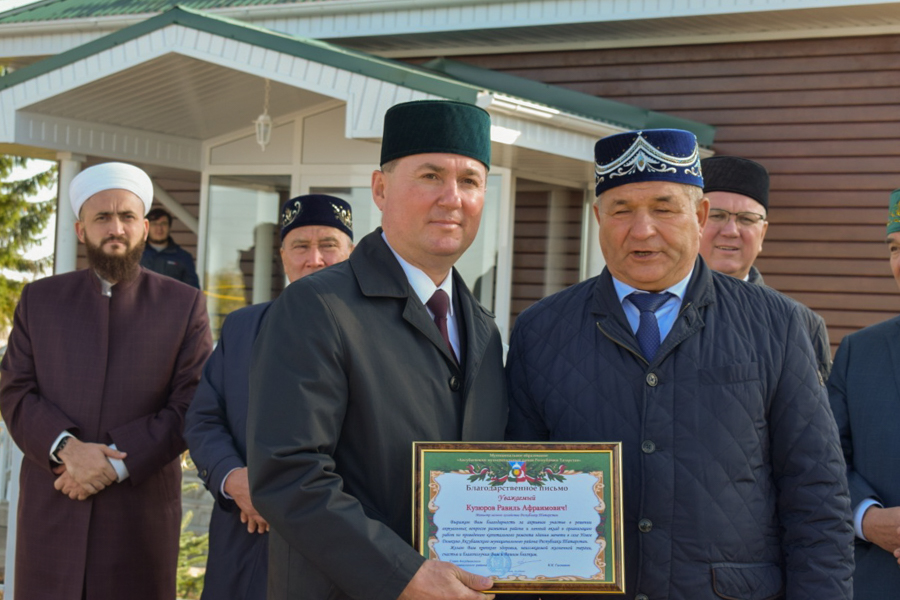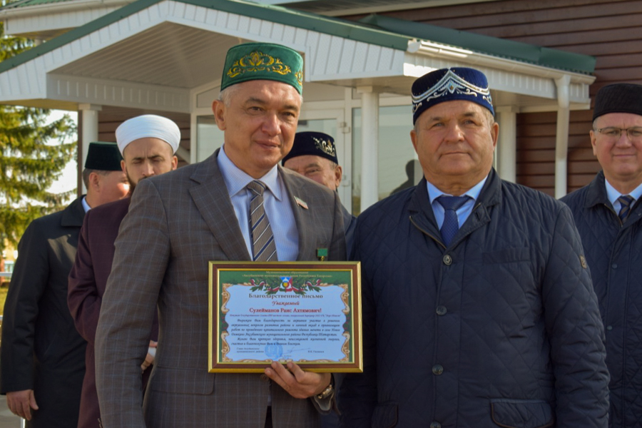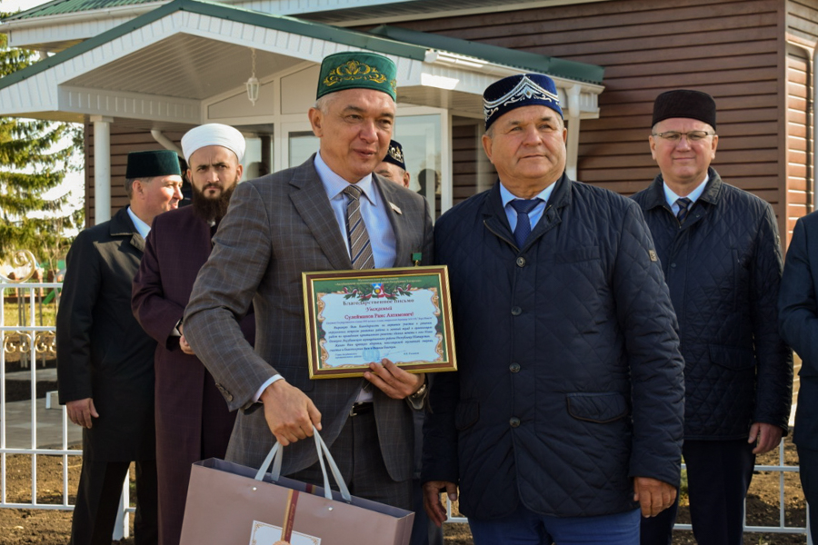 Аннары Мөфти Камил хәзрәт Сәмигуллин әлеге җирлектә төзекләндерелеп, мәһабәт гыйбадәт йортының кабаттан үз ишекләрен ачу тантанасына җыелучыларны сәламләп, аның буш тормавын, һәрвакыт халык, балалар, яшьләр белән тулы булсын дип теләкләрен җиткерде. Ул гамәлләрнең фазыйләтләре хакында, мәчетләр, гыйбадәтләр, Аллаһы юлында кылган игелекләр хакында бәян итте, аннары Равил Кузюровка, Рәис Сөләймановка рәхмәт хаты һәм нәзарәтнең “Бердәмлек” медален тапшырды. Мөфти шулай ук Яңа Дума авылы мәчете имам-хатыйбы Фәнис хәзрәт Низамовка чапан бүләк итеп тапшырды, мәчеткә шәмаил бүләк итте. Чара барышында Равил Кузюров белән Рәис Сөләймановның әтиләренә Коръән мәгънәләренең татар теленә тәрҗемәсе – «Кәлам Шәриф. Мәгънәви тәрҗемә» басмасын бүләк итте.