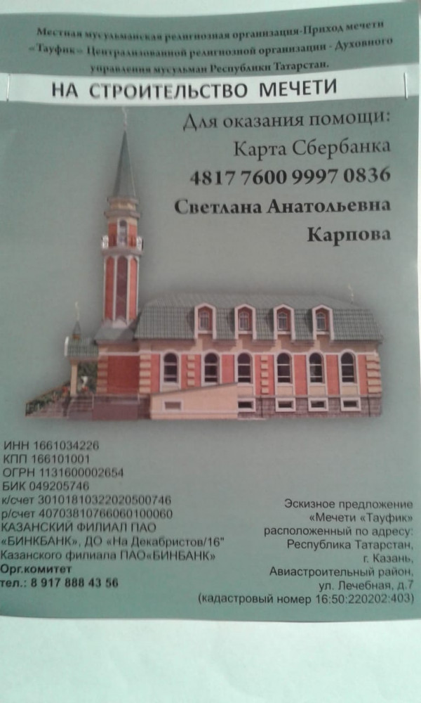 Уважаемые братья и сестры! Наш любимый Пророк Мухаммад ﷺ говорил: «Кто построит мечеть ради Аллаха, для того Аллах построит дом в раю». Если у вас есть желание принять участие в этом богоугодном деле, вы сможете оказать помощь следующим способом: