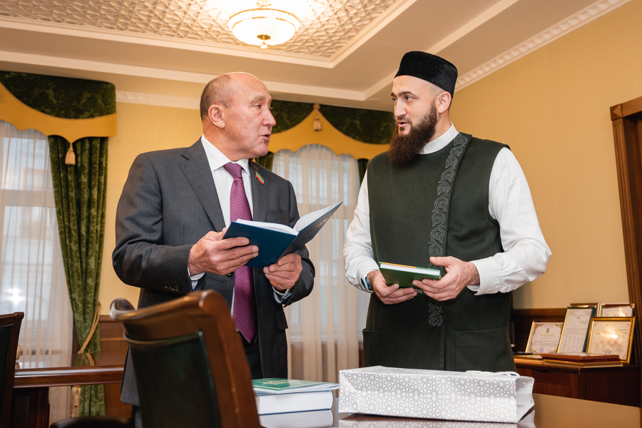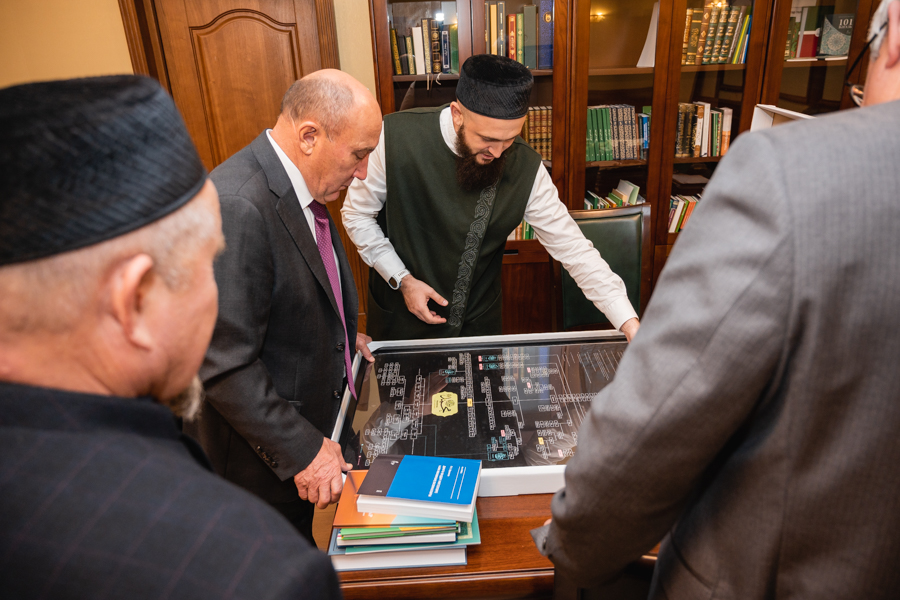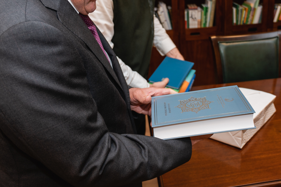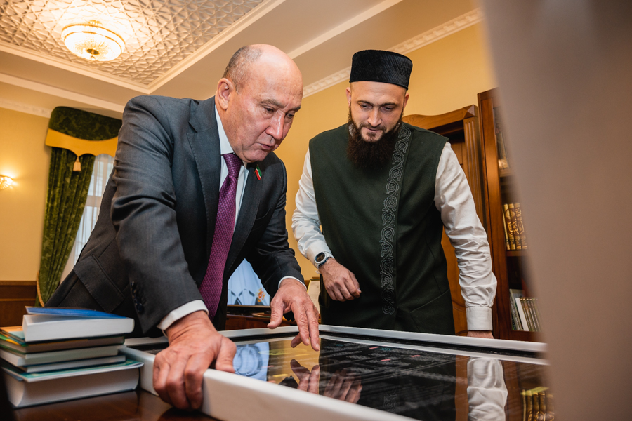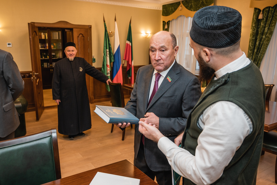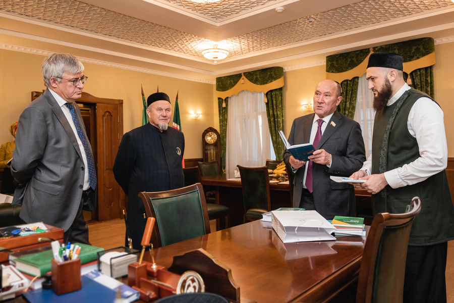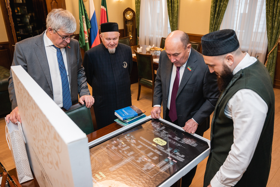 На встрече вся эта деятельность ДУМ РТ была высоко оценена вице-спикером Госсовета РТ Маратом Готовичем Ахметовым. Он отметил, что муфтият реализует множество проектов и находит их интересными. Камиль хазрат поблагодарил гостей за добрые слова и вручил им последние книжные новинки ИД "Хузур" ДУМ РТ, в том числе экземпляры переводов смыслов Куръана на татарский язык "Кәлам Шәриф. Мәгънәви тәрҗемә", изданных специальным тиражом для бесплатной раздачи в регионах с компактным проживанием татарских соотечественников. Особенный памятный подарок муфтий преподнес Марату Готовичу - панно с родословной и жизнеописанием Пророка Мухаммеда ﷺ. Заодно муфтий хазрат рассказал им об издательской деятельности ДУМ РТ, татароязычных религиозных медиапроектах, реализуемых на площадках ИД "Хузур" - телеканале "Хузур ТВ", радио "Азан", печатных СМИ и пр. Он также рассказал об электронной библиотеке darul-kutub.com и работе ДУМ РТ по поиску и оцифровке старинных татарских богословских трудов - их на сегодняшний день в общем бесплатном доступе на сайте библиотеки насчитывается около 1200 трудов.