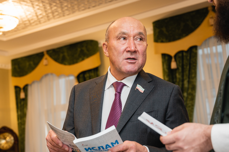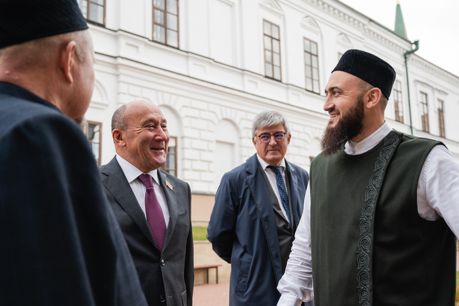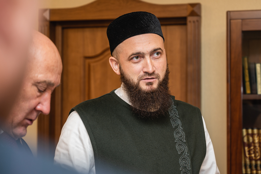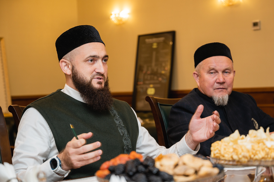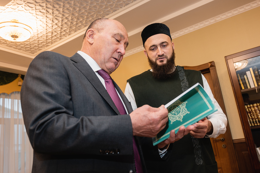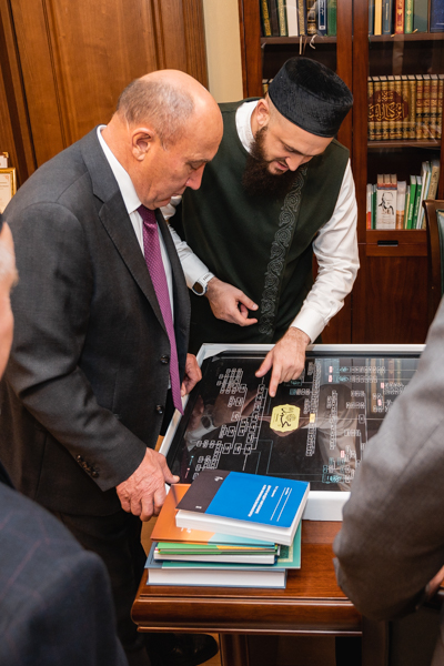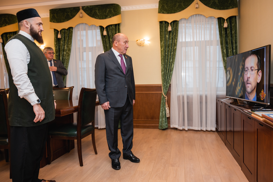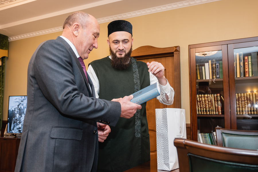 На встрече вся эта деятельность ДУМ РТ была высоко оценена вице-спикером Госсовета РТ Маратом Готовичем Ахметовым. Он отметил, что муфтият реализует множество проектов и находит их интересными. Камиль хазрат поблагодарил гостей за добрые слова и вручил им последние книжные новинки ИД "Хузур" ДУМ РТ, в том числе экземпляры переводов смыслов Куръана на татарский язык "Кәлам Шәриф. Мәгънәви тәрҗемә", изданных специальным тиражом для бесплатной раздачи в регионах с компактным проживанием татарских соотечественников. Особенный памятный подарок муфтий преподнес Марату Готовичу - панно с родословной и жизнеописанием Пророка Мухаммеда ﷺ. Заодно муфтий хазрат рассказал им об издательской деятельности ДУМ РТ, татароязычных религиозных медиапроектах, реализуемых на площадках ИД "Хузур" - телеканале "Хузур ТВ", радио "Азан", печатных СМИ и пр. Он также рассказал об электронной библиотеке darul-kutub.com и работе ДУМ РТ по поиску и оцифровке старинных татарских богословских трудов - их на сегодняшний день в общем бесплатном доступе на сайте библиотеки насчитывается около 1200 трудов.