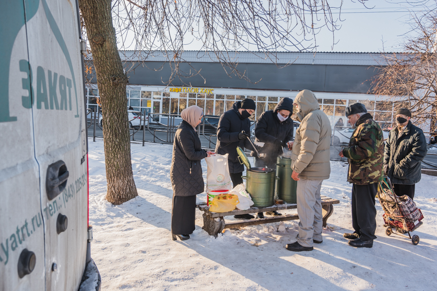 Благотворительный фонд «Закят» Духовного управления мусульман Татарстана возобновил благотворительные обеды под открытым небом для нуждающихся. Бесплатные порции горячего питания раздавали в сквере на Бурхана Шахиди г. Казани с 10:30 часов. Сегодня нуждающимся дали порции салата, горячие первое и второе блюда, хлеб, чай. Сотрудники фонда "Закят" в течение часа накормили более 50-ти человек. В дальнейшем обеспечение бездомных и нуждающихся горячим питанием будет проводиться каждую пятницу.