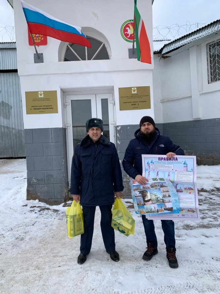 Имамы Бугульминского мухтасибата посетили следственный изолятор №3 г.Бугульма. В ходе визита имам-мухтасиб г.Бугульма и Бугульминского района Рамиль хазрат Хуснутдинов передал «Кәлам Шәриф. Мәгънәви тәрҗемә» на татарском языке в библиотеку исправительного учреждения. Также учреждению были переданы настенные календари на 2021 год, выпущенные Бугульминским мухтасибатом, с указанием праздничных и памятных дат мусульманского календаря, молитвенные коврики, обучающие чтению намаза для осужденных и труд муфтия РТ Камиля хазрата Самигуллина "Ислам в 75 уроках". Далее имамы осмотрели мусульманскую молельную комнату. Молельная комната дает возможность подсудимым и осужденным мусульманам соблюдать установления своей религии. Затем посетили камеру матери и ребенка с необходимыми условиями для нормального проживания и развития ребенка. Новорожденному провели обряд имянаречения. В завершении имамы посетили камеры учреждения и пообщались с заключенными.