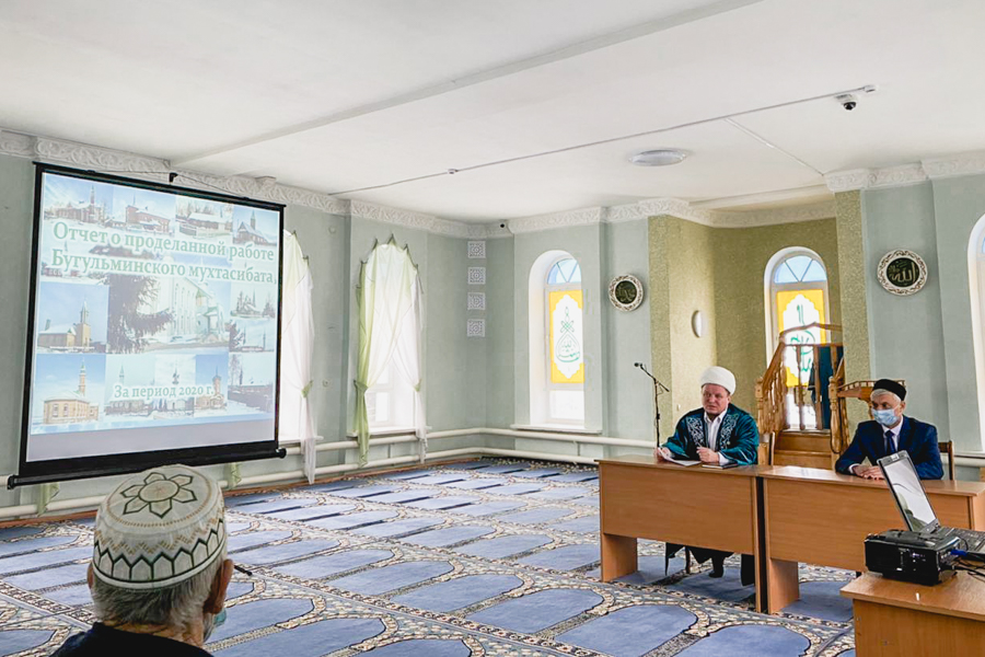 Рамиль хазрат ознакомил присутствующих с планом мероприятий на текущий 2021 год, который был объявлен в Республике Татарстан «Годом родных языков и народного единства». Затем вниманию присутствующих был показан годовой отчет о проделанной работе Бугульминского мухтасибата за 2020 год на слайдах.