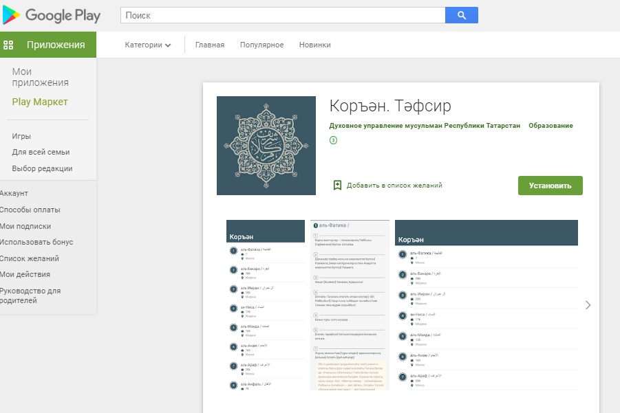 Чтобы найти приложение с андроида в поисковой строке к названию приложения «Коран. Тафсир» необходимо дописать ДУМ РТ.