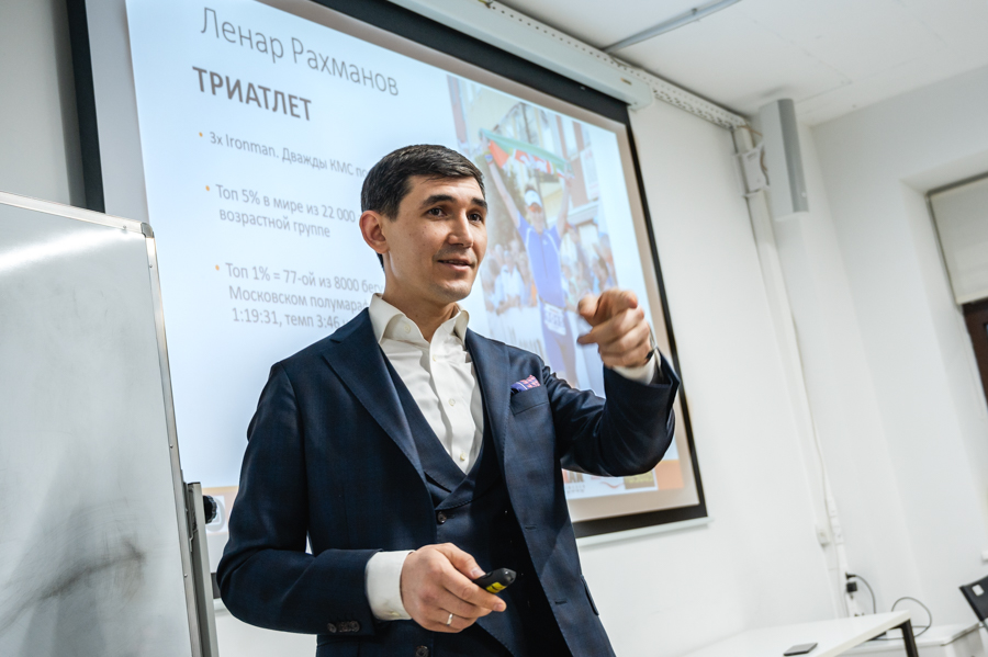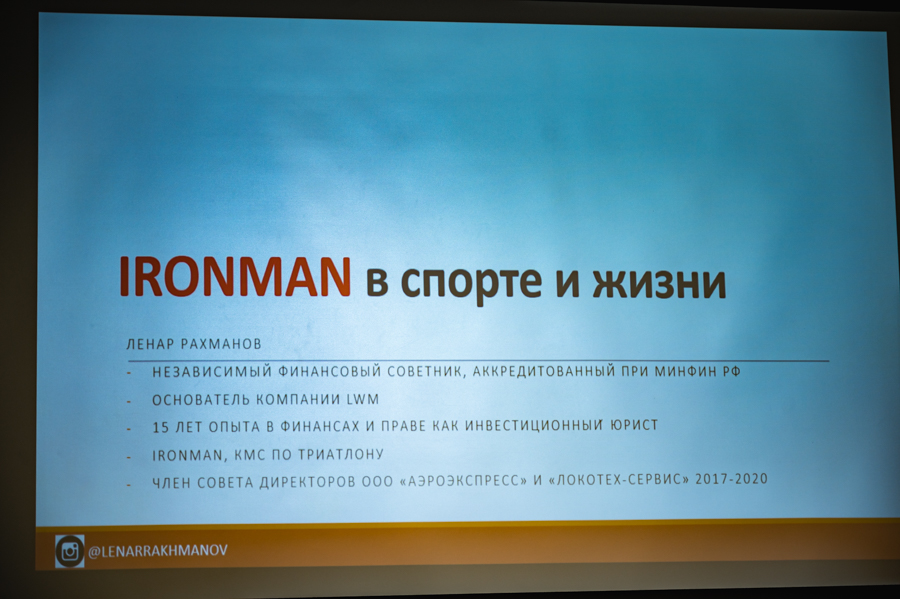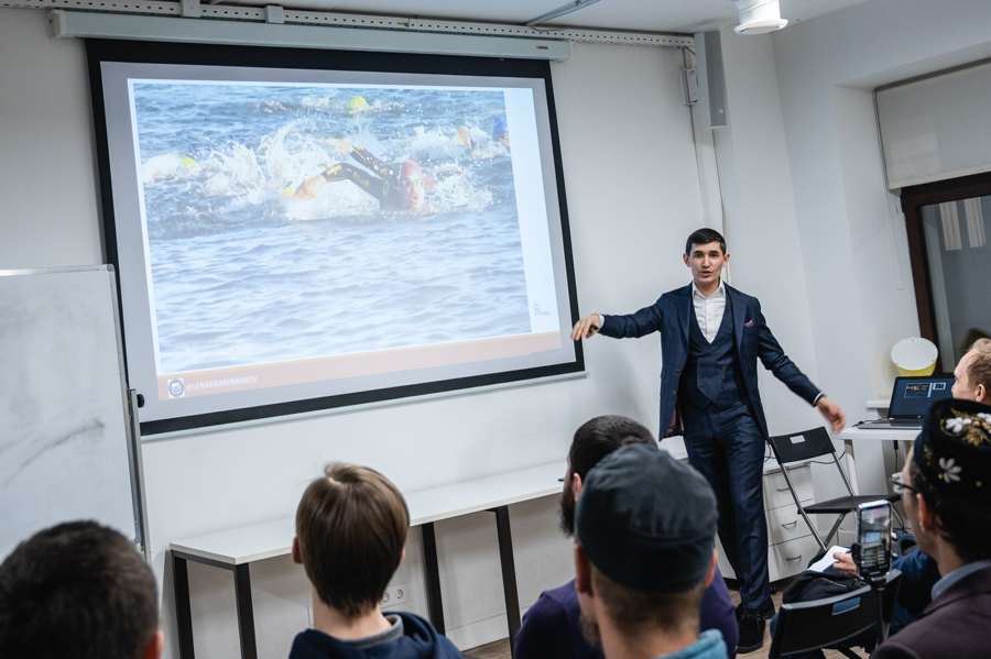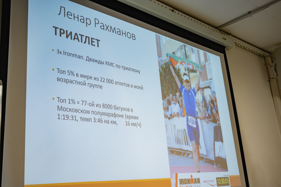 Спикер поделился своим опытом подготовки и участии в спортивных соревнованиях Ironman и сказал, что принципы Ironman всегда актуальны: такие соревнования помогают реализовать поставленные перед собой цели, учат дисциплине, закаляют тело и дух, помогают не растеряться перед трудностями. Ленар Рахманов пришел в спорт, чтобы стать примером для детей. Самое главное – никогда не поздно начать здоровый образ жизни. Каждая дистанция начинается с первого шага, нужно просто погрузиться в спорт и не бросать тренировки.