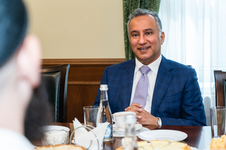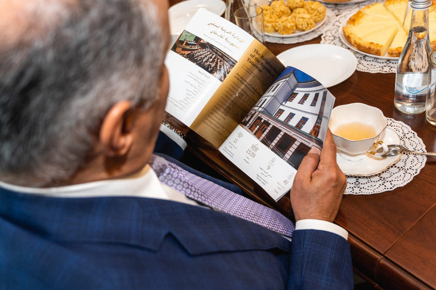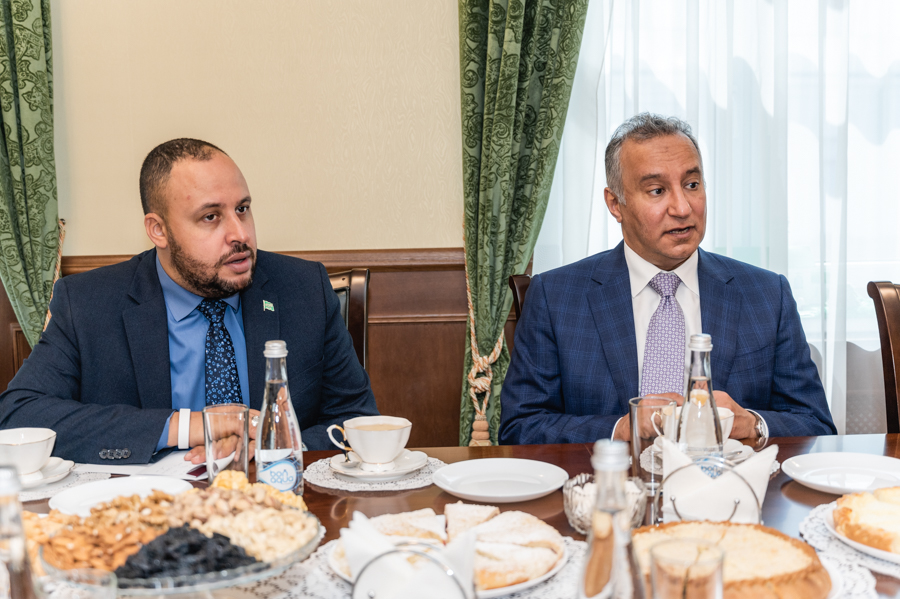 Далее встреча продолжилась за чайным столом. Камиль хазрат рассказал послу КСА о деятельности ДУМ РТ и его учрежденых организаций: Издательском доме “Хузур”, хадж-операторе “ДУМ РТ Хадж”, Комитете по стандару “Халяль”, благотворительном фонде “Закят”, Фонде “Вакф РТ” и др. Особенно активный интерес гость проявил к таким проектам муфтията, как онлайн-медресе, телеканал “Хузур ТВ”, мобильные приложения, книги-бестселлеры, выпущенные в ДУМ РТ - переводы Куръана на русский и татарский языки, а также сборника хадисов “Сахих аль-Бухари” в версии “Зубдат” и пр. Посол высоко оценил достижения муфтията в области корановедения, просвещения, издательского дела, благотворительности.